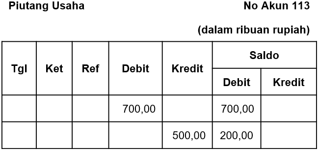 Pada 10 Januari 2020 salon Ayu memperoleh pendapatan jasa sebesar Rp700.000,00 dibayar dua kali angsuran. Pada 30 Januari 2020 diterima angsuran piutang usaha dari pelanggan Rp500.000,00. Hitunglah saldo akun piutang usaha berdasarkan transaksi tersebut!