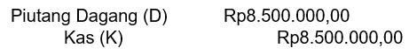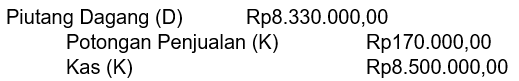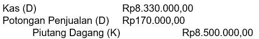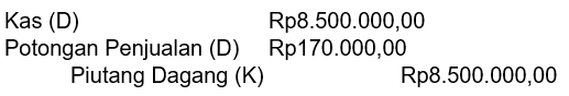 Pada 20 Februari 2021 UD Ramai menerima pelunasan piutang dagang dari toko Mikasa atas faktur tanggal 9 Februari 2021 sebesar Rp8.500.000,00 dengan syarat pembayaran 2/15, n/30. Pencatatan yang dilakukan oleh UD Ramai adalah ....