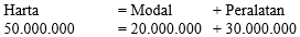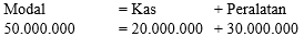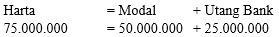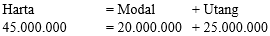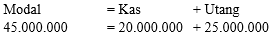 Pada awal berdirinya perusahaan jasa, pemilik menginvestasikan uangnya Rp20.000.000,00, peralatan seharga Rp30.000.000,00. Untuk memperkuat usahanya, pemilik memperoleh kredit dari bank Rp25.000.000,00. Berdasarkan data di atas, persamaan akuntansi perusahaan adalah…