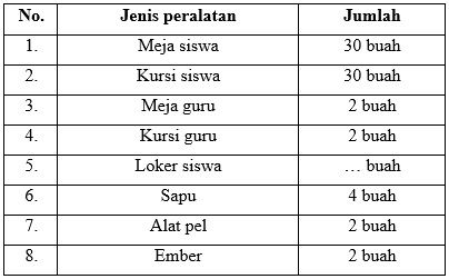 Pada awal tahun pembelajaran, wali kelas VI A sedang mendata kebutuhan peralatan kelas. Jumlah siswa pada kelas tersebut adalah 30 siswa. Kebutuhan yang didata adalah meja siswa 30 buah, kursi siswa 30 buah, meja guru 2 buah, kursi guru 2 buah, loker siswa 30 siswa, sapu 4 buah, alat pel 2 buah, dan ember 2 buah.