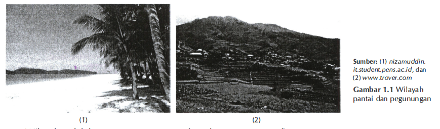 Pada gambar di atas, terdapat dua wilayah yang berbeda, yaitu wilayah pantai dan wilayah pegunungan. Sebutkan ciri atau karakteristik dari masing-masing wilayah tersebut!