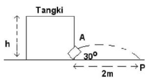 Pada gambar di bawah ini, air dalam tangki memancar keluar melalui lubang A dan membentuk sudut 30o terhadap lantai. Jika pancaran airnya sampai di P maka tinggi (h) air dalam tangki adalah ....