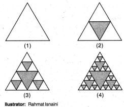 Pada gambar-gambar di bawah ini, gambar berikutnya diperoleh dengan menambah gambar segitiga sama sisi berwarna hitam yang ukuran sisinya setengah dari setiap segitiga warna putih yang tersisa pada gambar selanjutnya.