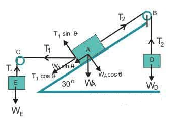 Jika tali AC horizontal dan tali AB sejajar bidang, serta bidang miring dan katrol licin, maka sistem akan setimbang untuk berat D sebesar …
