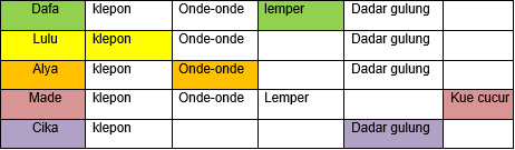 Pada hari minggu, Ibu Kintan pergi ke pasar tradisional. Ibu Kintan ingin membelikan jajanan pasar untuk anaknya, namun yang tersisa hanya 1 jenis jajanan pasar kesukaan yang dapat diberikan kepada setiap anaknya. Ibu Kintan kemudian membelikan jajanan pasar yang berbeda tersebut untuk setiap anaknya. Berikut ini jajanan pasar yang disukai oleh anaknya Ibu Kintan. Dafa, anak sulung Ibu Kintan menyukai kue klepon, onde-onde, lemper, dan dadar gulung. Lulu dan Alya mempunyai kesamaan dalam kue kesukaan mereka. Mereka menyukai onde-onde, dadar gulung, dan klepon. Made menyukai onde-onde, klepon, lemper, dan kue cucur. Cika menyukai klepon dan dadar gulung. Berdasarkan penjelasan tersebut, jajanan pasar yang dapat dibelikan oleh Ibu Kintan untuk Made adalah ....