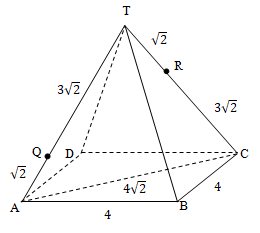 Pada limas segiempat T.ABCD, panjang sisi tegak adalah cm dan panjang sisi alas adalah 4 cm, titik Q berada di AT dengan AQ : AT = 1 : 4 lalu titik R berada pada TC dimana TR : RC = 1 : 3 panjang QR adalah…