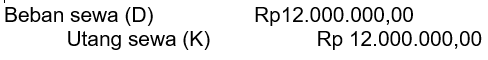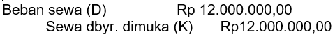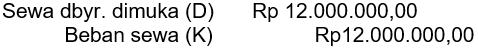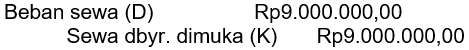 Pada neraca saldo Rapi laundry untuk periode 31 Maret 2021 tercatat akun beban sewa gedung sebesar Rp12.000.000,00. Sewa telah dibayar pada 1 Januari 2021 untuk masa satu tahun. Penyusunan jurnal pembalik yang tepat pada 1 April 2021 adalah ....