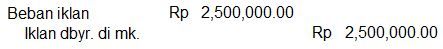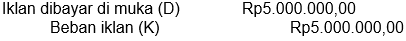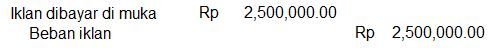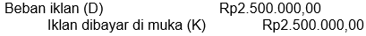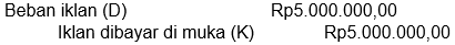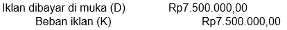 Pada neraca saldo studio foto Alif mencatat akun beban iklan sebesar Rp7.500.000,00. Iklan dibayar tanggal 1 September 2020 untuk dua belas kali penerbitan. Data penyesuaian per 31 Desember 2020 menunjukkan iklan tersebut terbit dua kali sebulan.