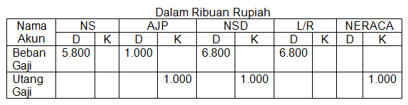 Pada neraca saldo toko Putih per 30 Maret 2020 diketahui beban gaji karyawan sebesar Rp5.800.000,00. Pada akhir periode terdapat gaji karyawan yang belum dibayar untuk dua orang masing-masing sebesar Rp500.000,00. Oleh toko Putih penyelesaian yang benar pada kertas kerja terkait peristiwa tersebut adalah ....