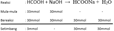 Pada pencampuran 50 mL asam format (HCOOH) 0,66 M () dengan 25 mL NaOH 1,2 M diperoleh larutan dengan pH sama dengan ...
