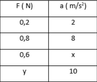 Pada percobaan di laboratorium terkait konsep Hukum II Newton, diperoleh data di bawah ini. Jika F = gaya dan a = percepatan, maka nilai x dan y adalah ...