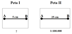 Pada peta tanpa skala, diketahui jarak A-B adalah 5 cm. Pada peta dengan skala 1: 100.000, jarak dua lokasi yang sama adalah 25 cm. Maka skala peta A-B adalah.…