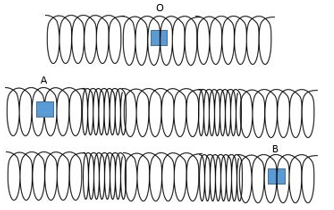 Pada salah satu bagian dari sebuah slinki diberi tanda biru seperti yang nampak pada gambar. Slinki tersebut selanjutnya digetarkan sehingga membentuk gelombang longitudinal. Tercatat tanda biru pada slinki tersebut bergerak dari titik O ke titik A dan dari titik O ke titik B dengan selang waktu yang sama.
