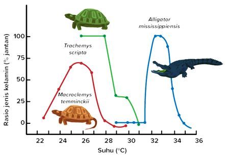 Pada sebagian reptil, jenis kelamin ditentukan oleh suhu inkubasi selama embrio. Grafik berikut menunjukkan rasio jenis kelamin terhadap suhu pada tiga spesies reptil, yaitu Trachemys scripta, Macroclemys temminckii, dan Alligator mississippiensis. Sumbu X menunjukkan suhu, sedangkan sumbu Y menunjukkan rasio jenis kelamin (% jantan).