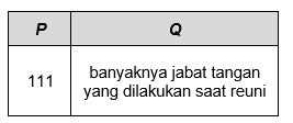 Pada sebuah acara reuni keluarga dihadiri oleh 24 orang pasangan suami istri dan 5 orang masih anak-anak. Pada acara tersebut, setiap orang akan berjabat tangan satu sama lainnya dengan syarat setiap orang tidak boleh berjabat tangan dengan orang yang lebih tua. Setiap orang di acara tersebut diketahui memiliki usia yang berbeda-beda.
