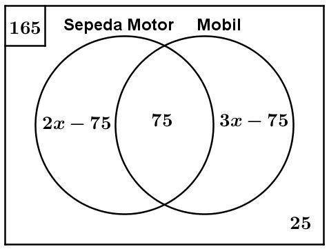 Pada sebuah pendataan kepada 165 warga tentang kepemilikan sepeda motor dan mobil, diperoleh hasil 25 warga tidak memiliki keduanya dan 75 warga memiliki keduanya. Jika perbandingan banyak warga yang memiliki mobil dan sepeda motor 3 : 2, maka banyak warga yang hanya memiliki sepeda motor adalah ....