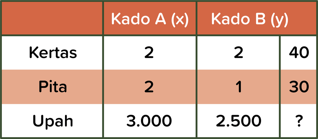 lembar kertas pembungkus dan meter pita. Tersedia kertas pembungkus 40 lembar dan pita 30 meter. Jika upah untuk membungkus kado jenis