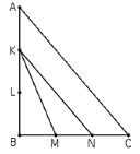 Pada segitiga siku-siku samakaki ABC di atas, sisi AB dan BC masing-masing terbagi menjadi tiga bagian yang sama berturut-turut oleh titik K,L,M, dan N. Jika luas segitiga ABC adalah maka luas segitiga KMN adalah … . (SBMPTN 2017)