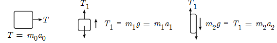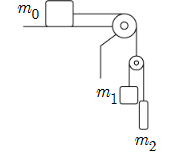 Pada sistem di bawah ini hitung percepatan yang dialami oleh benda m1, anggap m2 bergerak ke bawah ! (mo = 3 kg, m1 = 1 kg, m2 = 2 kg)