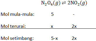 Pada suhu dalam suatu wadah bervolume 1 L mula-mula terdapat 5 mol gas . Kemudian gas ini terdisosiasi sebagian menjadi gas sesuai reaksi: