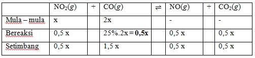 Pada suhu tertentu dalam wadah 1 L, campuran NO2 dan CO mula-mula dalam perbandingan 1:2. Pada saat 25% CO bereaksi, tercapai kesetimbangan: