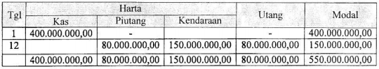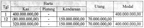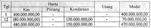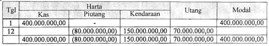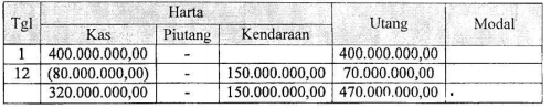 Pada tanggal 1 Januari 2012 Tuan Akmal menyetorkan uangnya sebagai modal awal perusahaan jasa transportasi ”CV.Akmal“ sebesar Rp400.000.000,00. Pada tanggal 12 Januari 2012 terdapat transaksi pembelian armada baru dibayar sebesar Rp80.000.000,00, dari yang seharusnya Rp150.000.000,00 sisanya dibayarkan secara kredit. Pengaruh transaksi terhadap harta, uang dan modal perusahaan Tuan Akmal adalah ...
