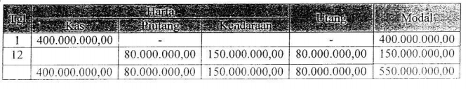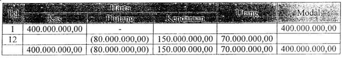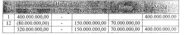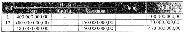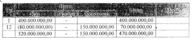 Pada tanggal 1 Januari 2012 Tuan Akmal menyetorkan uangnya sebagai modal awal perusahaan jasa transportasi "CV Akmal" sebesar Rp400.000.000,00. Pada tanggal 12 Januari 2012 terdapat transaksi pembelian armada baru dibayar sebesar Rp80.000.000,00 dari yang seharusnya Rp150.000.000,00 sisanya dibayar secara kredit. Pengaruh transaksi terhadap harta, uang, dan modal perusahaan Tuan Akmal adalah ....