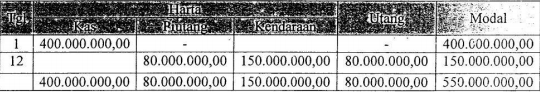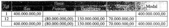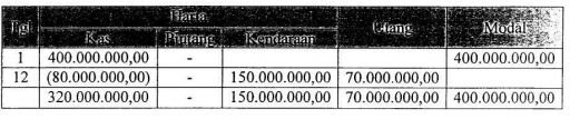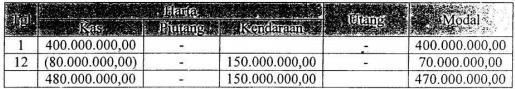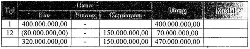 Pada tanggal 1 Januari 2012 Tuan Akmal menyetorkan uangnya sebagai modal awal perusahaan jasa transportasi "CV. Akmal" sebesar Rp400.000.000,00. Pada tanggal 12 Januari 2012 terdapat transaksi pembelian armada baru dibayar sebesar Rp80.000.000,00, dari yang seharusnya Rp150.000.000,00 sisanya dibayarkan secara kredit. Pengaruh transaksi terhadap harta, utang dan modal perusahaan Tuan Akmal adalah ....