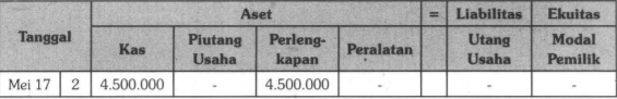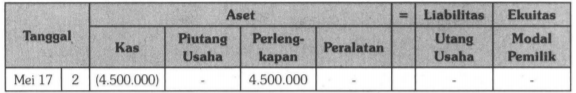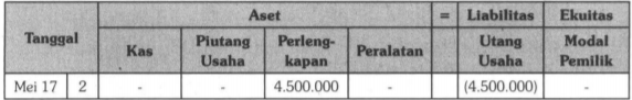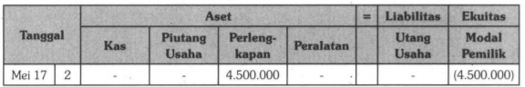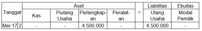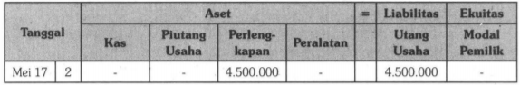 Pada tanggal 2 Mei 2017, dibeli perlengkapan secara kredit pada Toko Mahkota sebesar Rp4.500.000,00. Persamaan dasar akuntansi yang tepat untuk transaksi tersebut adalah ....