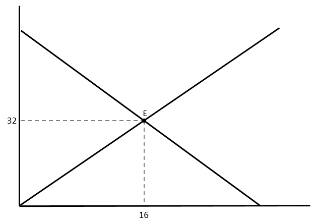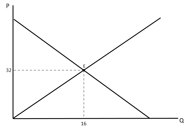 Pada tingkat harga Rp900,00 jumlah barang yang ditawarkan sebanyak 450 unit sedangkan pada tingkat harga Rp1.000,00 jumlah barang yang ditawarkan 500 unit. Jika fungsi permintaanQ = 80 – 2P, kurva keseimbangan pasar berikut ini yang sesuai dengan data-data tersebut yaitu…