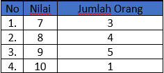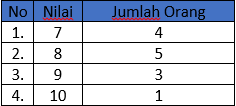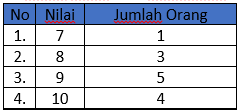 Tabel yang sesuai untuk data nilai seperti di atas yaitu ….