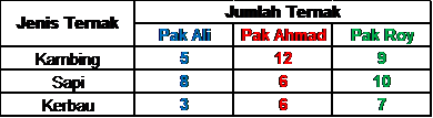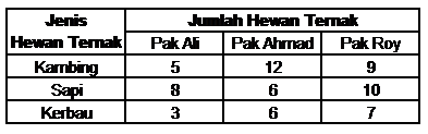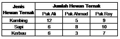 Pak Ali, Pak Ahmad dan Pak Roy memiliki beberapa jenis hewan ternak, yaitu kambing, sapi, dan kerbau.. Pak Ahmad memiliki 12 kambing, 6 sapi dan 6 kerbau. Pak Ali memiliki 5 kambing, 8 sapi, dan 3 kerbau, sedangkan Pak Roy memiliki 9 kambing, 10 sapi, dan 7 kerbau.