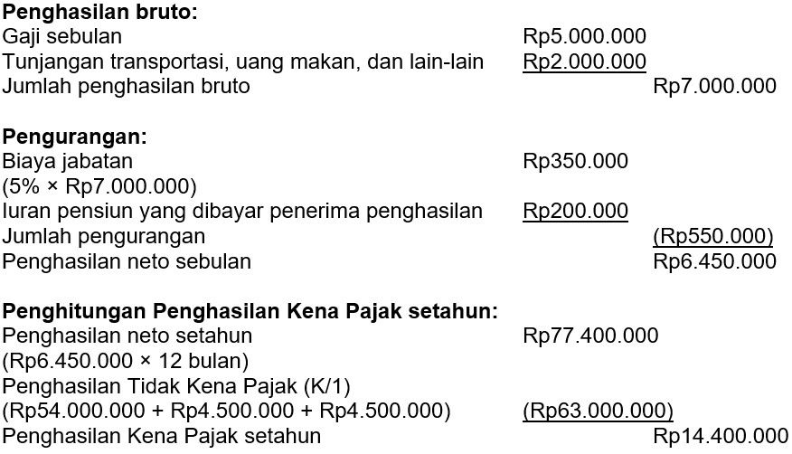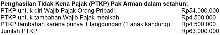 Pak Arman merupakan karyawan yang sudah menikah dengan anak 1, memperoleh gaji pokok Rp 5.000.000/ bulan, tunjangan transportasi, uang makan, dan lain lain Rp 2.000.000, Membayar iuran pensiun Rp 200.000 / bulan dan biaya jabatan 5%. Hitunglah pajak terutang Pak Arman!