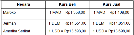 Harga jual tembakau ke Maroko 1 ton = MAD736; ke Jerman 1 ton = DEM103; ke Amerika Serikat 1 ton = USD129. Total ekspor tembakau Pak Doni jika dikonversi dari rupiah ke USD adalah ....