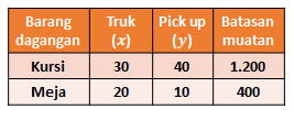 Pak Lukman adalah seorang pengusaha mebel. Pak Lukman ingin mengirim barang dagangannya yang terdiri dari paling sedikit 1.200 kursi dan 400 meja. Untuk keperluan tersebut, pak Lukman menyewa truk dan pick up. Truk dapat memuat 30 kursi dan 20 meja. Pick up dapat memuat 40 kursi dan 10 meja. Bagaimana model matematika dari permasalahan di atas?