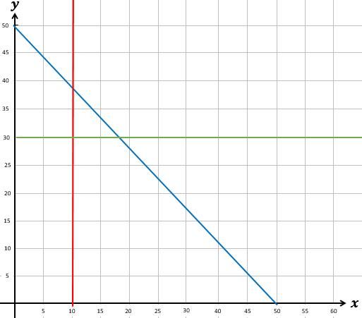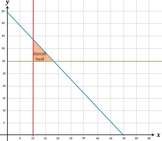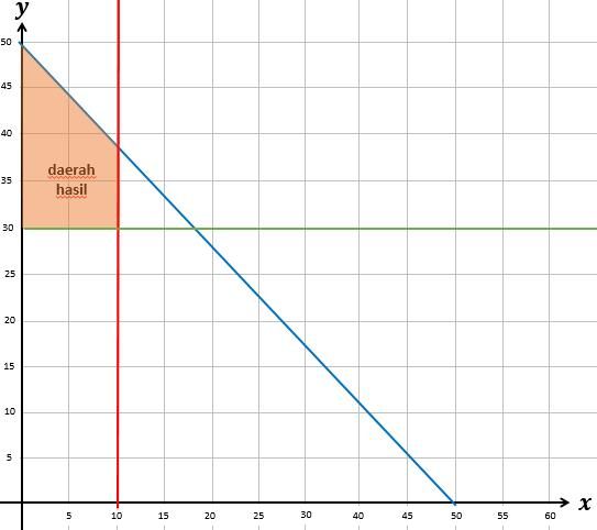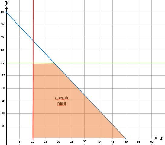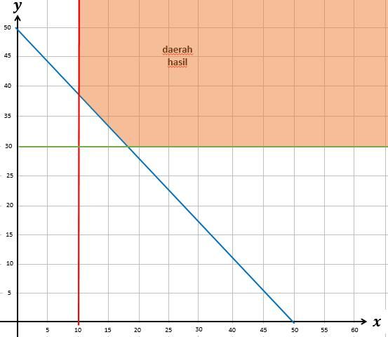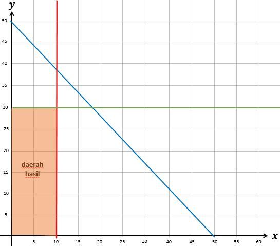 Pak Mulya adalah seorang pendaki gunung senior. Dia memiliki koleksi tas gunung ukuran 80L tak kurang dari 10 dan tas gunung ukuran 60L yang tak lebih dari 30 pasang. Pak Mulya ingin terus menambah koleksi barang tas gunungnya namun gudang miliknya hanya mampu menampung sebanyak 50 buah. Sistem pertidaksamaan linear dua variabel yang menggambarkan kondisi di atas adalah ….