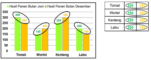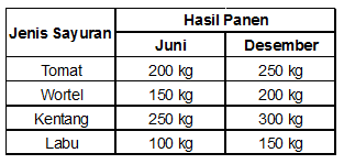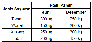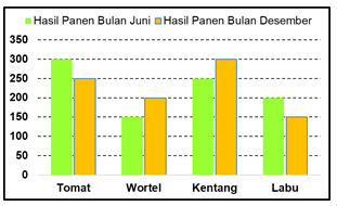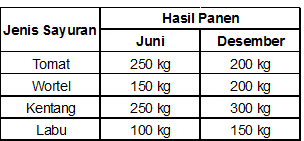 Pak Rustam memiliki beberapa petak tanah yang ditanami beberapa jenis sayuran. Dalam satu tahun, Pak Rustam memanen sayur di bulan Juni dan Desember. Catatan hasil panen di bulan Juni dan Desember oleh Pak Rustam dibuat dalam bentuk diagram seperti di bawah ini,