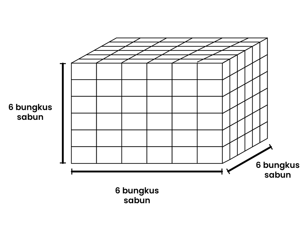 Pak Yanto membeli sekardus sabun untuk persediaan tokonya. Setiap sabun dikemas dalam bungkus berbentuk balok kecil. Di dalam kardus, sabun-sabun itu disusun dengan panjang 6 bungkus, lebar 6 bungkus, dan tinggi 6 bungkus. Berapa jumlah seluruh sabun dalam kardus itu?