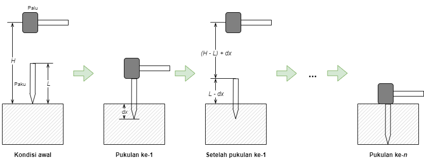 yang dihasilkan pada pukulan ke-(n - 1). Diperlukan n pukulan palu agar seluruh paku masuk,