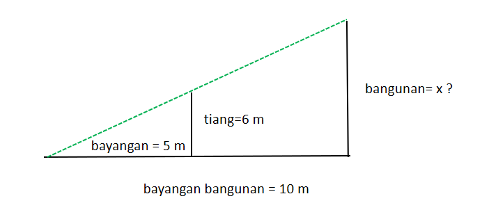Panjang bayangan sebuah bangunan dan tiang listrik pada waktu yang sama masing-masing 10 m dan 5 m. Jika tinggi tiang listrik 6 m, hitunglah tinggi bangunan tersebut!