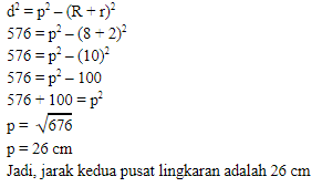 Panjang jari-jari dua lingkaran adalah 8 cm dan 2 cm. Jika panjang garis singgung persekutuan dalam adalah 24 cm, maka jarak kedua pusat lingkaran adalah….