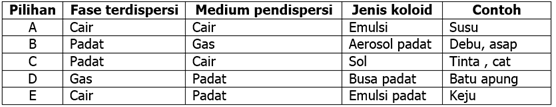 Pasangan medium pendispersi dan fase terdispersi dengan jenis sistem koloid berikut, yang paling tepat adalah….