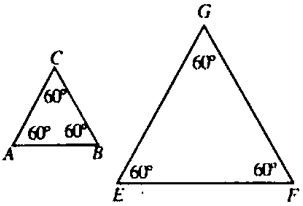 Pasangan segitiga berikut memiliki sudut-sudut yang bersesuaian sama besar. Apakah kedua segitiga sebangun? Untuk itu, ukurlah setiap panjang sisi yang bersesuaian dengan penggaris.
