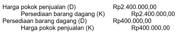 PD Cikarang memiliki data persediaan awal sebesar Rp2.400.000,00 dan persediaan akhir Rp400.000,00. Jurnal penyesuaian metode HPP yang benar adalah ….