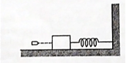 Peluru dengan massa 50 gram ditembakkan ke arah balok bermassa 0,95 kg yang terletak pada bidang datar licin dihubungkan dengan pegas, seperti pada gambar. Hal itu menyebabkan pegas tertekan 20 cm. Perhitungan menunjukkan bahwa gaya sebesar 1 N dapat menyebabkan pegas tertekan 1 cm. Besar kecepatan mula-muka peluru adalah ….