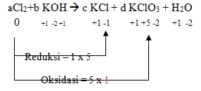 Pembuatan KClO3 sebagai bahan peledak dengan mereaksikan gas Cl2 ke dalam larutan KOH menurut reaksi berikut: