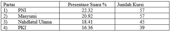 1) PNI 2) Partai Masyumi 3) Nahdlatul Ulama 4) PKI