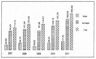Ekspor nonmigas dari tahun 2007 – 2011 lebih tinggi dari migas