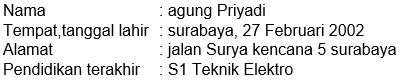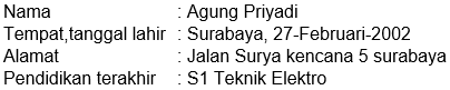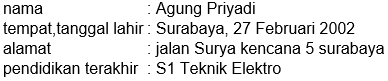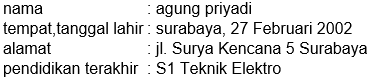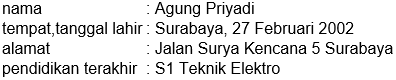 Penulisan pemerian biodata pada CV yang tepat adalah ....