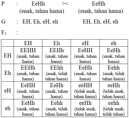 Penyilangan antara tanaman padi yang enak rasanya, tetapi tidak tahan hama (EEhh) dengan tanaman padi yang tidak enak rasanya, tetapi tahan hama (eeHH) menghasilkan padi yang enak rasanya dan tahan hama (EeHh). Sifat rasa enak dominan terhadap tidak enak dan sifat tahan hama dominan terhadap tidak tahan hama. Apabila F1 disilangkan sesamanya, akan dihasilkan F2 dengan perbandingan fenotipe... .